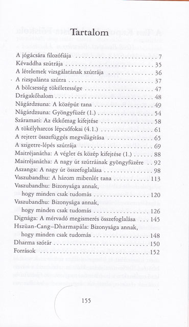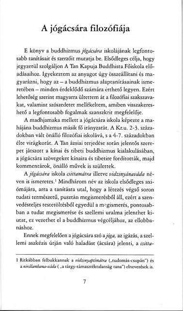 E könyv a buddhizmus jógácsára iskolájának legfontosabb tanításait és szerzőit mutatja be. Elsődleges célja, hogy jegyzetül szolgáljon A Tan Kapuja Buddhista Főiskola előadásaihoz. A szerző igyekezett az anyagot úgy összeállítani és magyarázni, hogy az - a buddhizmus alaptanításainak ismeretében - minden érdeklődő számára érthető legyen. Ezért lehetőség szerint magyarra ültette át a filozófiai szakszavakat, valamint szószedetet mellékelt. A madhjamaka mellet a jógácsára iskola képezte a mahájána buddhizmus másik fő irányzatát. A Kr.u. 2-3. századokban vált önálló filozófiai iskolává, s a 4-7. századokban élte virágkorát. A tan ázsiai terjedése során jelentős szerepet játszott a kínai és tibeti buddhizmus kialakulásában, a jógácsára szövegeket kínaira és tibetire fordították, majd kommentárok, önálló művek is születtek..
