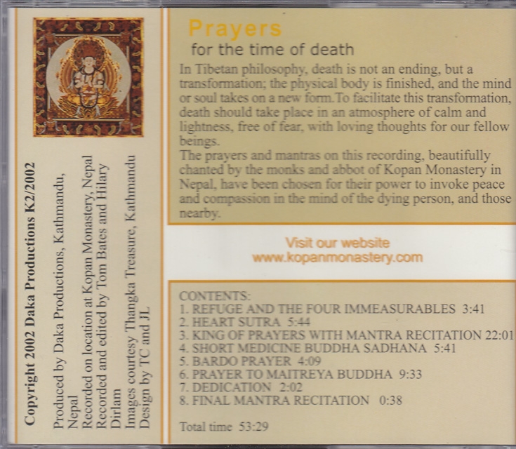 Prayers, practices and mantras chanted by the abbot of Kopan Monastery, Khenrinpoche Geshe Lhundrup, together with the monks. it contains the ten powerful mantras, the short Medicine Buddha practice, the 'King of Prayers' and other prayers usually recited when someone is about to die or has passed away.
